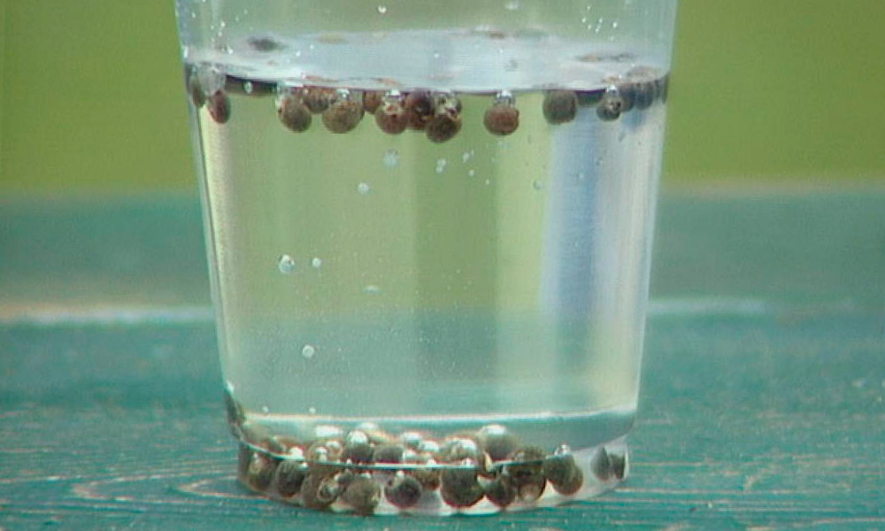 This is a simple preliminary way to assess quality. Seeds are poured with room temperature water and left for 10–20 minutes. Full seeds usually sink, while empty or damaged ones remain on the surface.